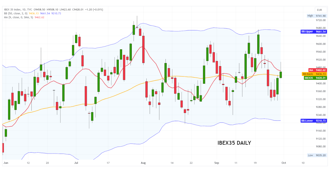 Der Ibex35 Index (Referenzindex des spanischen Aktienmarktes) schwankt seit über drei Monaten seitwärts innerhalb eines horizontalen Kanals, der durch den Widerstand bei 9.700-9.750 Punkten und die Unterstützung bei 9.200-9.170 Punkten begrenzt wird.