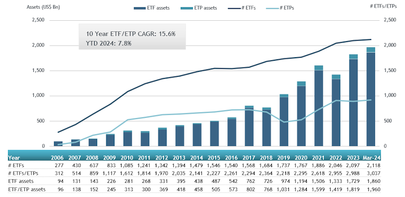 - Assets invested in the ETFs industry in Europe reached a record $1.96 Tn at the end of March beating the previous record of $1.90 Tn at the end of February 2024.