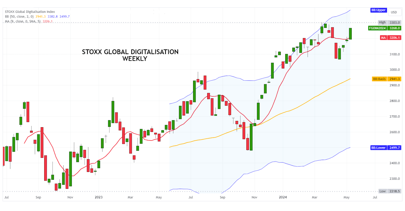 The Stoxx Global Digitalisation index, after having fallen towards the end of last October towards the graphic support placed at 2,480 points, in fact made an important bullish movement that pushed the quotations close to 3,300 points.