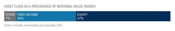 As a percentage of total notional value, equities accounted for 57% and fixed income for 36%, with the remainder comprising commodity and specialty ETFs.