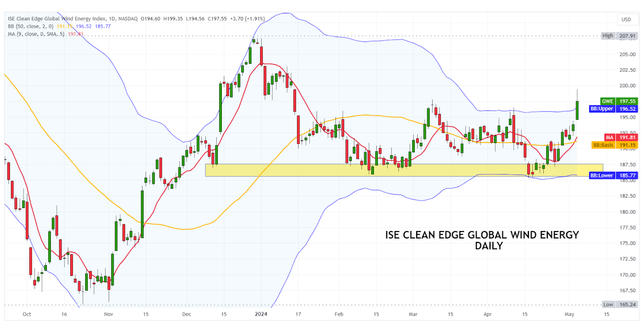 El índice ISE Clean Edge Global Wind Enegy ha construido en los últimos meses una interesante base de acumulación por encima del soporte gráfico situado en 185,50 puntos.