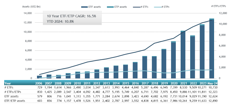 The Global ETFs industry had 12,323 products, with 24,729 listings, assets of $12.89 Tn, from 752 providers listed on 80 exchanges in 63 countries at the end of May.