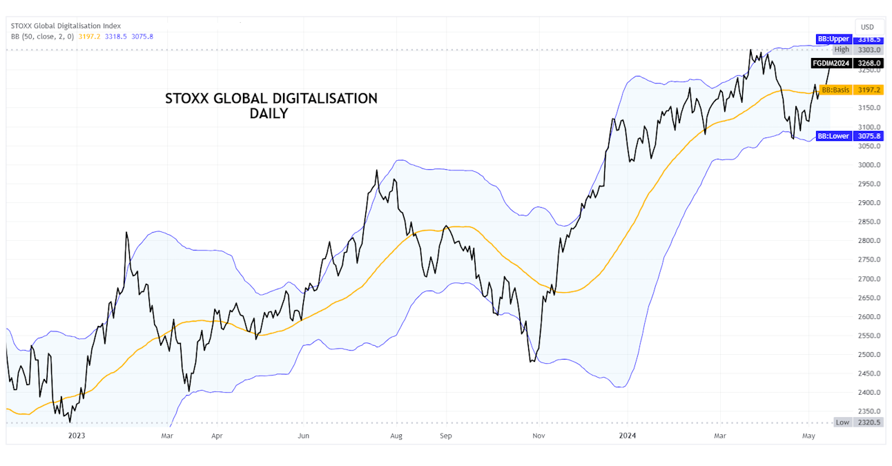 The Stoxx Global Digitalisation index, after having fallen towards the end of last October towards the graphic support placed at 2,480 points, in fact made an important bullish movement that pushed the quotations close to 3,300 points.