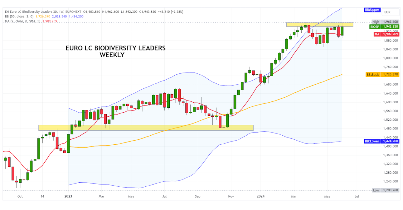 The Euro Biodiversity Leaders index is within a solid medium-term bullish trend, with prices rising to a peak of 1,965 points.