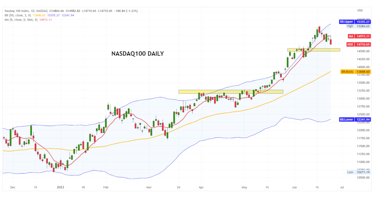 Prices, after starting 2023 near 10,700 points, began a solid bullish movement and rose to a peak of 15,284 points. From this last level, an inevitable correction then began, which pushed the market back down to near 14,700.