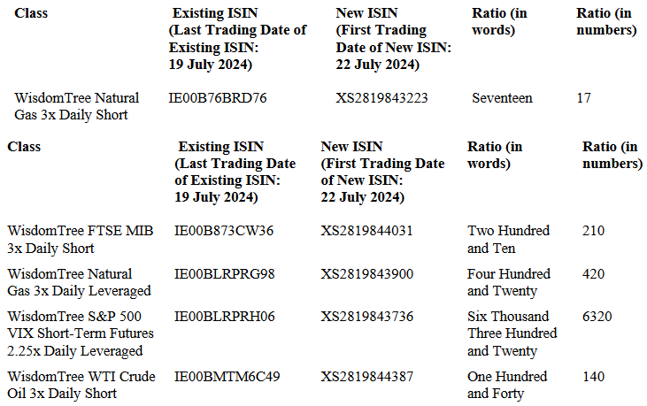 WisdomTree Multi Asset Issuer Public Limited Company announces that pursuant to Condition 17.2, it will be effecting a split at the close of business on 19 July 2024 of the following class of Collateralised exchange traded product (“ETP”) Securities: